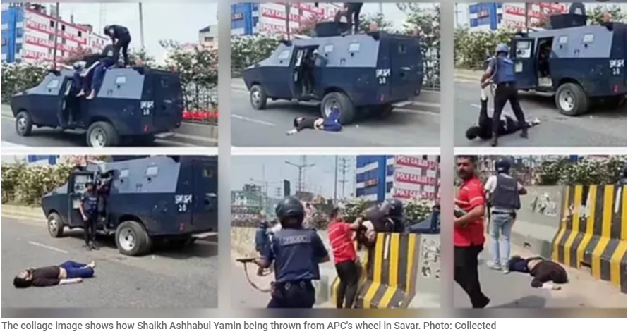 Around 2:30pm, as the APC neared the old overbridge near the Savar bus stand, Shaikh Ashhabul Yamin climbed onto the APC after crossing the road divider.