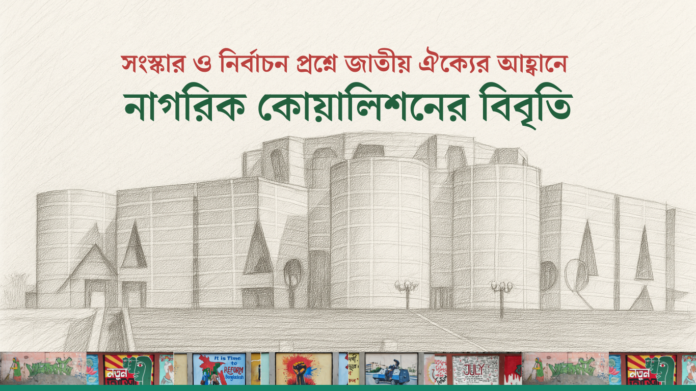 নাগরিক কোয়ালিশন অন্তর্বর্তীকালীন সরকার কাছে দাবি জানাচ্ছি যে, তারা যেন অনতিবিলম্বে জাতির সামনে এবং সংশ্লিষ্ট অংশীজনদের উদ্দেশ্যে উপরে উল্লেখিত জাতীয় গুরুত্বপূর্ণ বিষয়ে তাদের নীতিগত সিদ্ধান্তের পেছনের যুক্তি ও ব্যাখ্যা হাজির করেন।